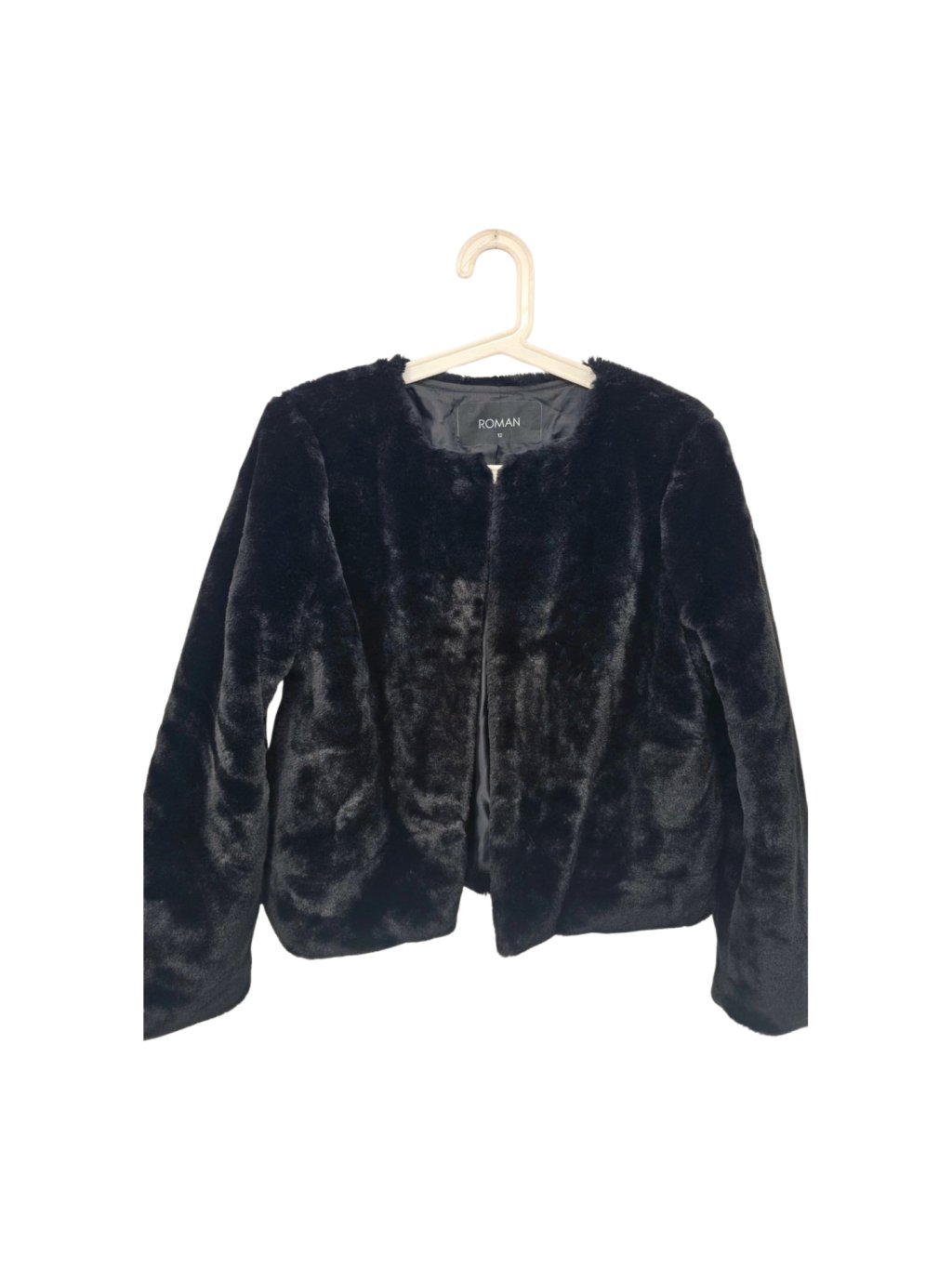heboučký kabát z umělé kožešiny , není těžký , má kapsy , s podšívkou, zapínání na háčky