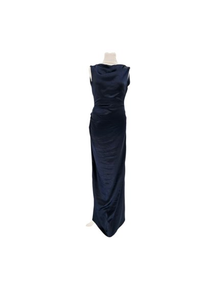 tmavě modré splývavé zajímavě řešené šaty v saténovém materiálu