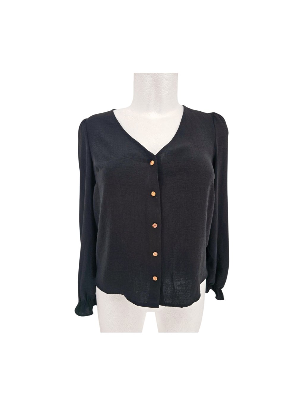 vel. S - 38 - splývavá průhledná propínací halenka, volný střih , jako nová , ještě má pytlíček s náhradním knoflíkem , uvnitř na ramenou poutka na top,...