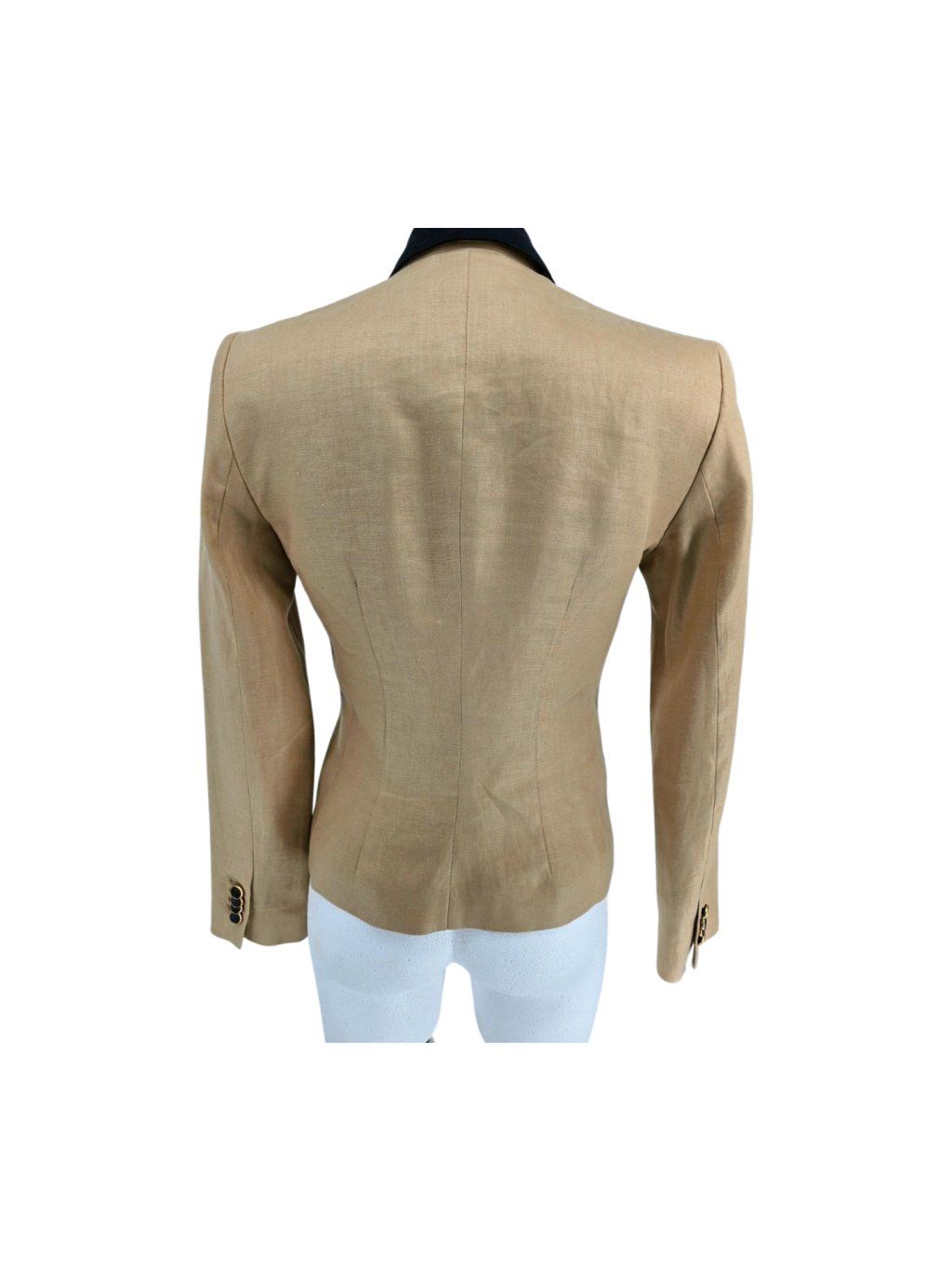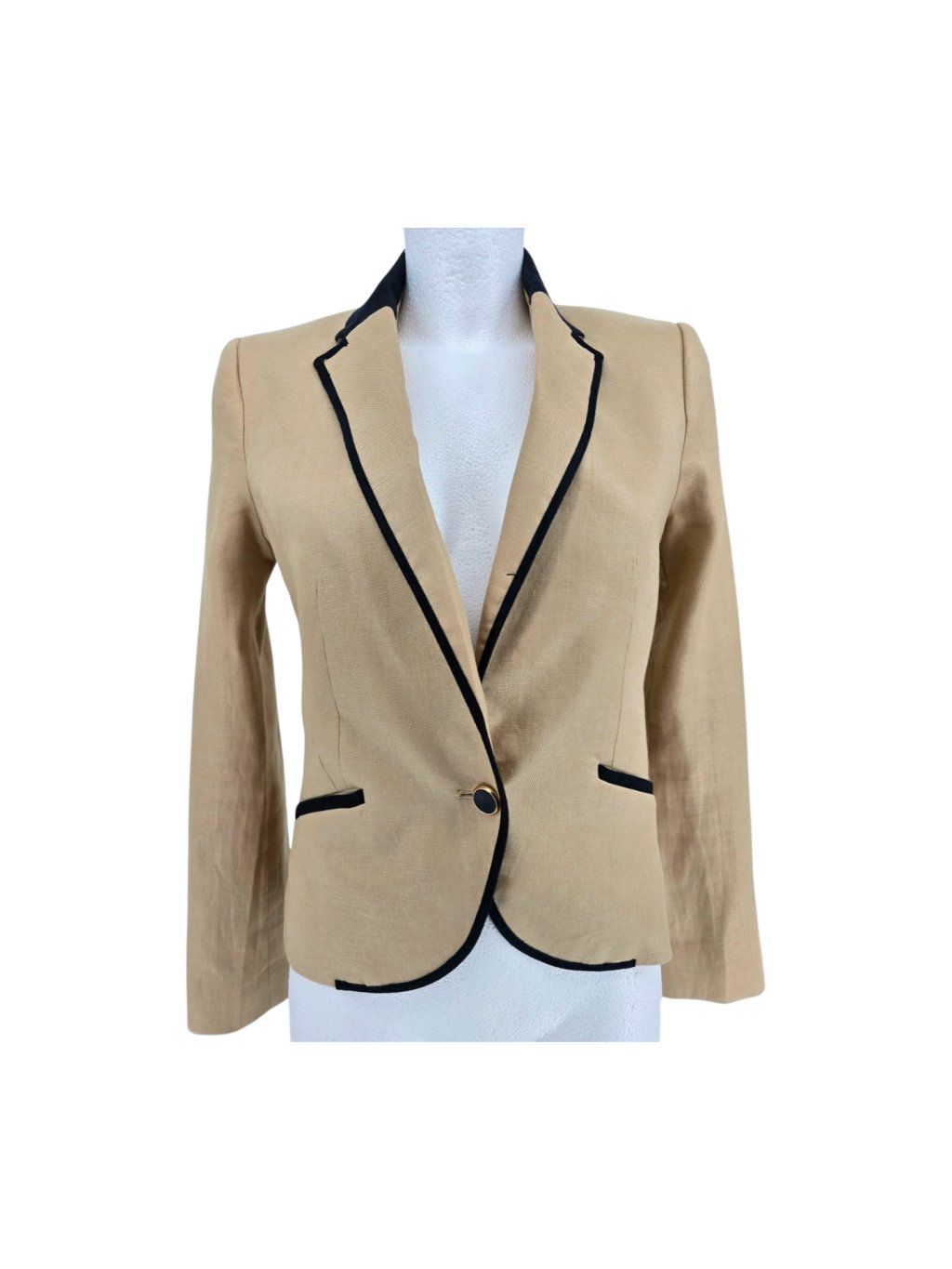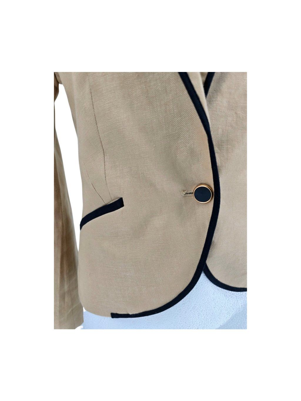 vel. 32 - pískové sako s černými detaily , hezky propracované , kratší vypasovaný střih