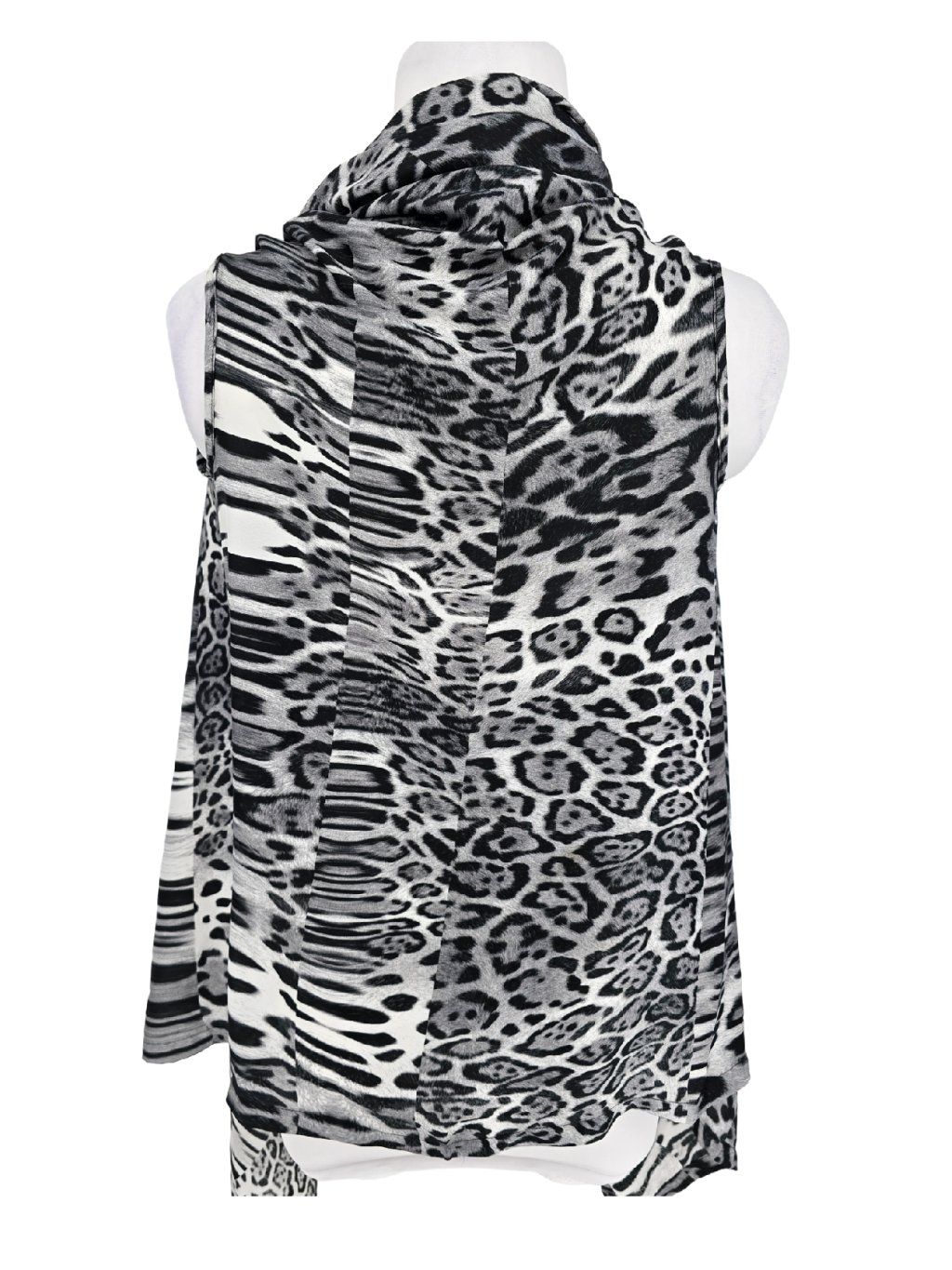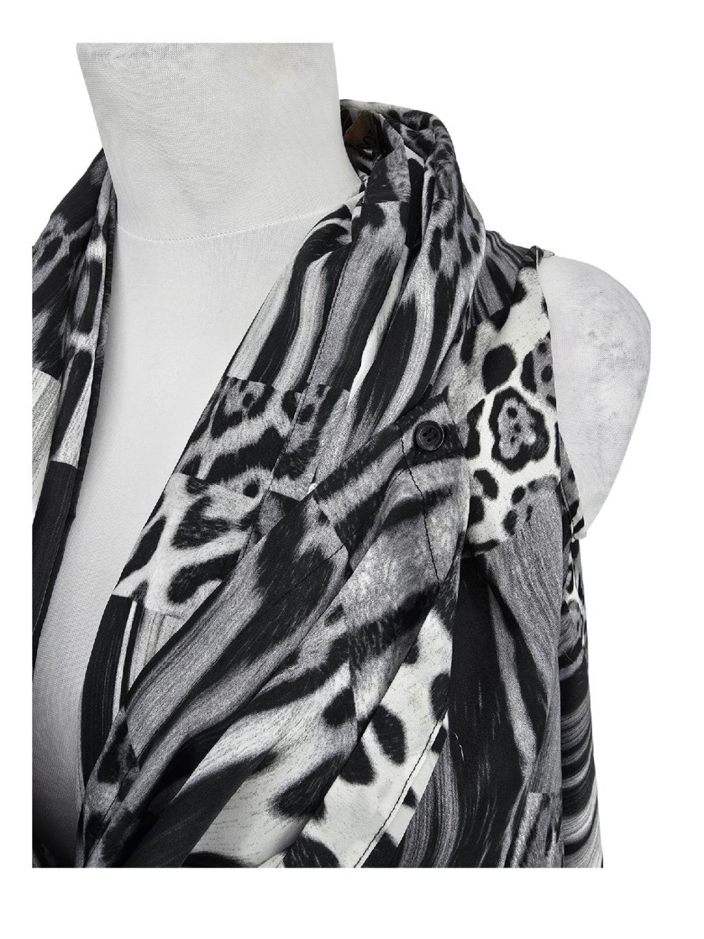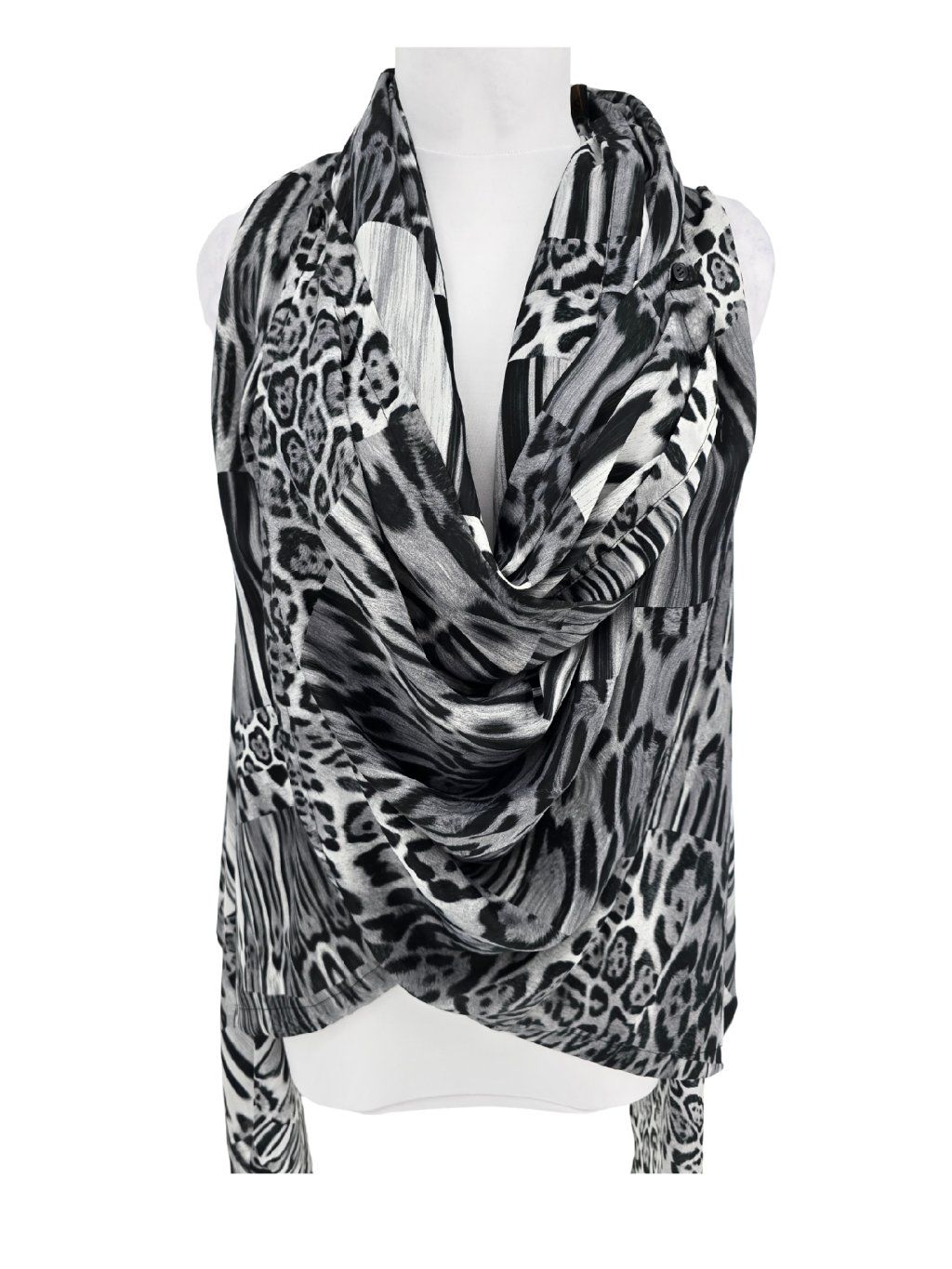 vel. neuvedena , ale spíše menší - cca 36/38 - podle šířky zad v průramcích , zajímavý splývavý lehký pléd , po zapnutí a překřížení cípů na ramena ( knoflíčky ) lze nosit i jako top