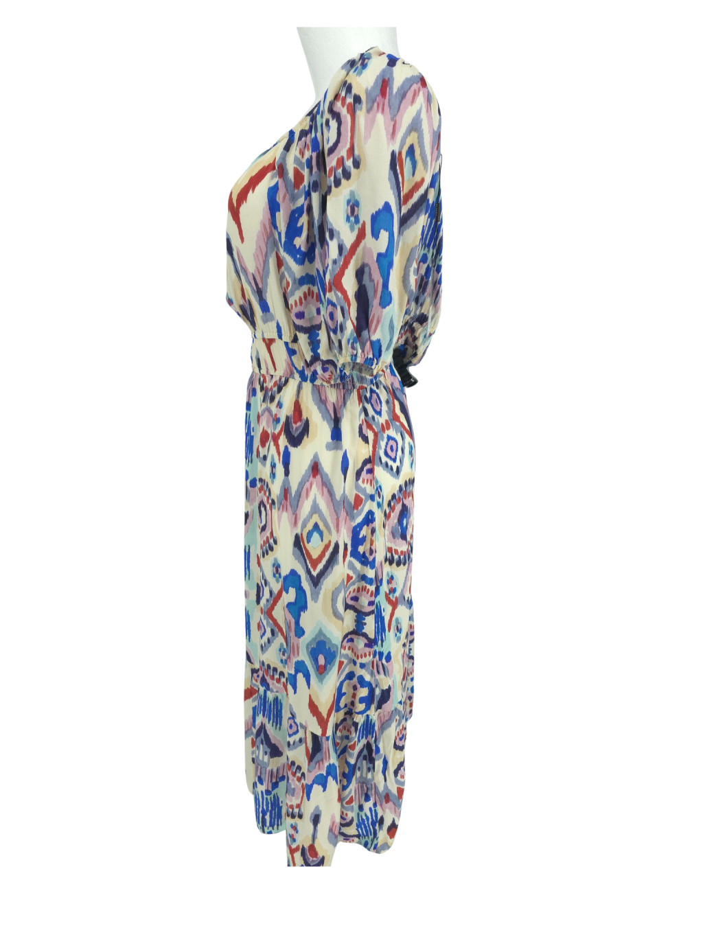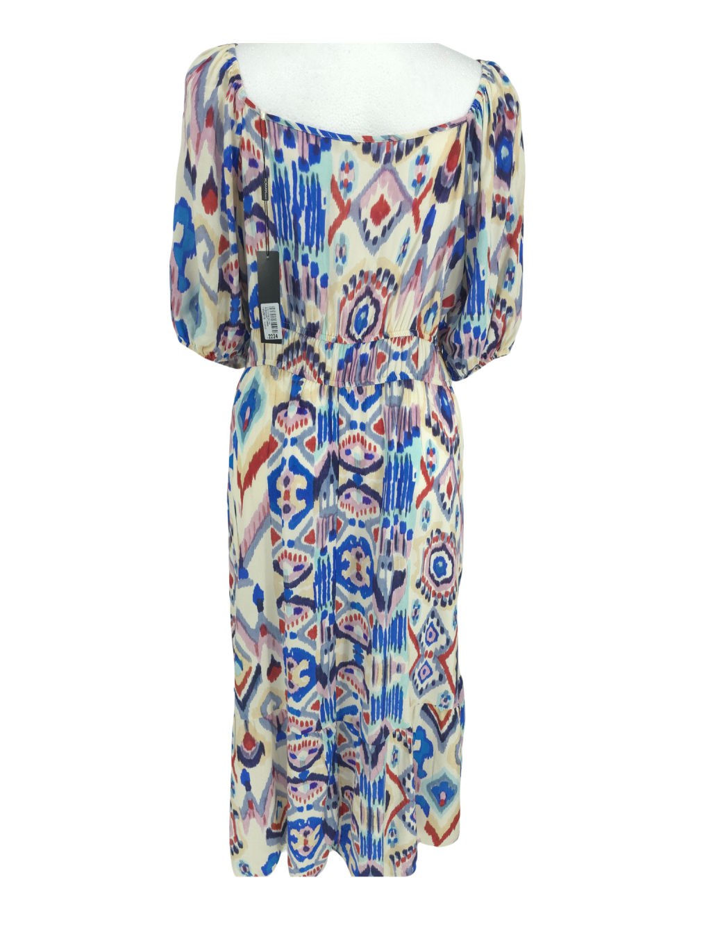 vel. M - cca 42 , ale i 44 - pružné nemačkavé šaty s výrazným vzorem , dolní okraj do kulata s rozparky po stranách , mají kapsy