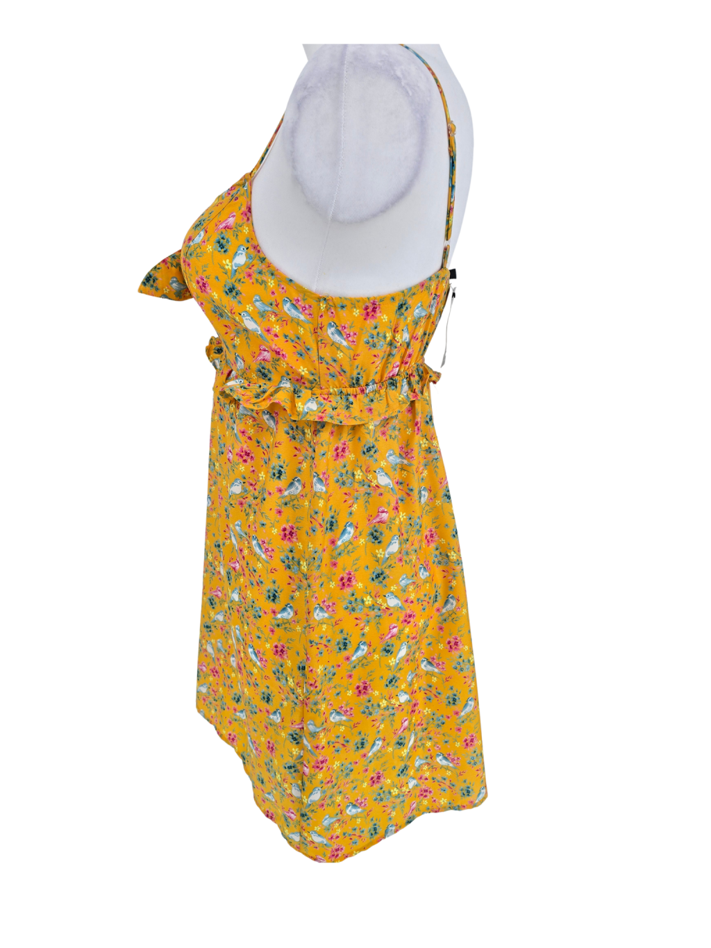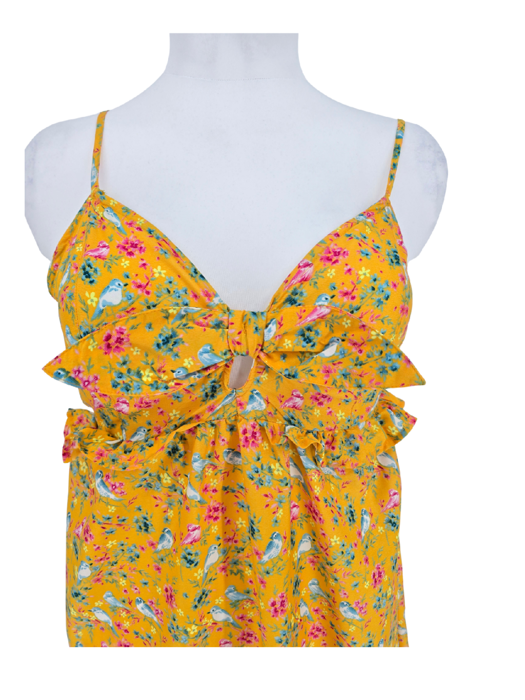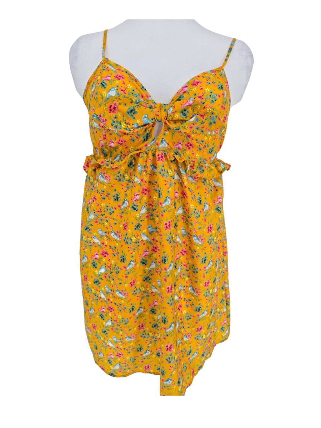 vel. UK 14 , ale jsou menší , max. 40 - nemačkavé šatičky ve výrazné barvičce, s ptáčky a květy , posuvná ramínka