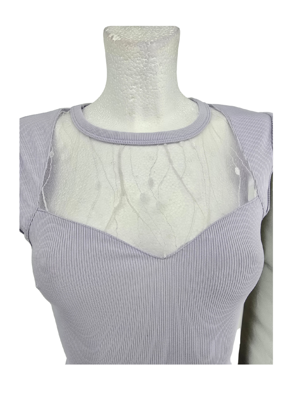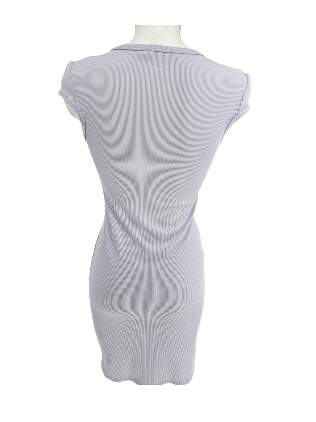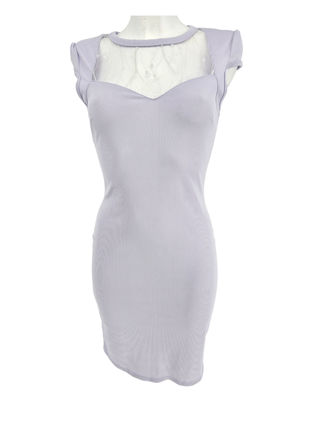 vel. M - ale jsou menší cca 36 - pružné žebrované šaty s průhlednou částí výstřihu , opravdu jemná pastelová lehce fialová barva