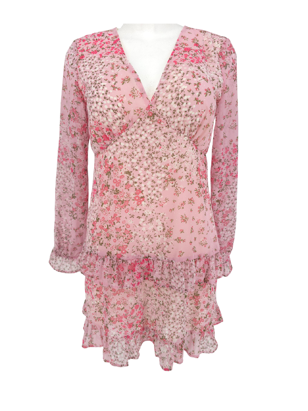 vel. UK 14 EUR 42 - růžové květované šatičky s volánky , lehký mat. , vespod pružná lehká podšívka mimo rukávů , ty lehce prosvítají , v pase vzadu slabší guma