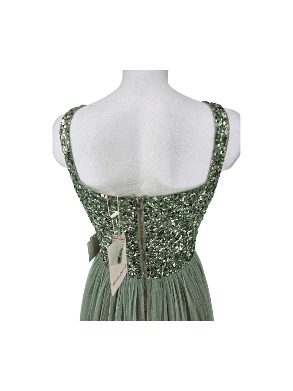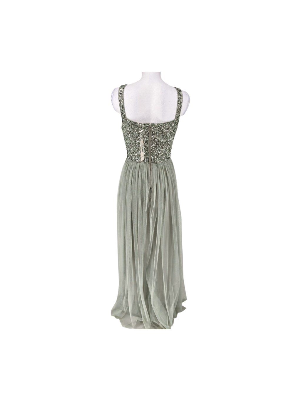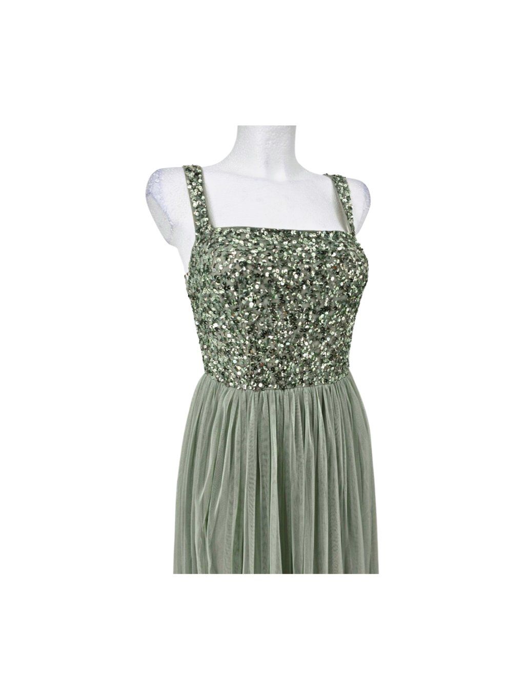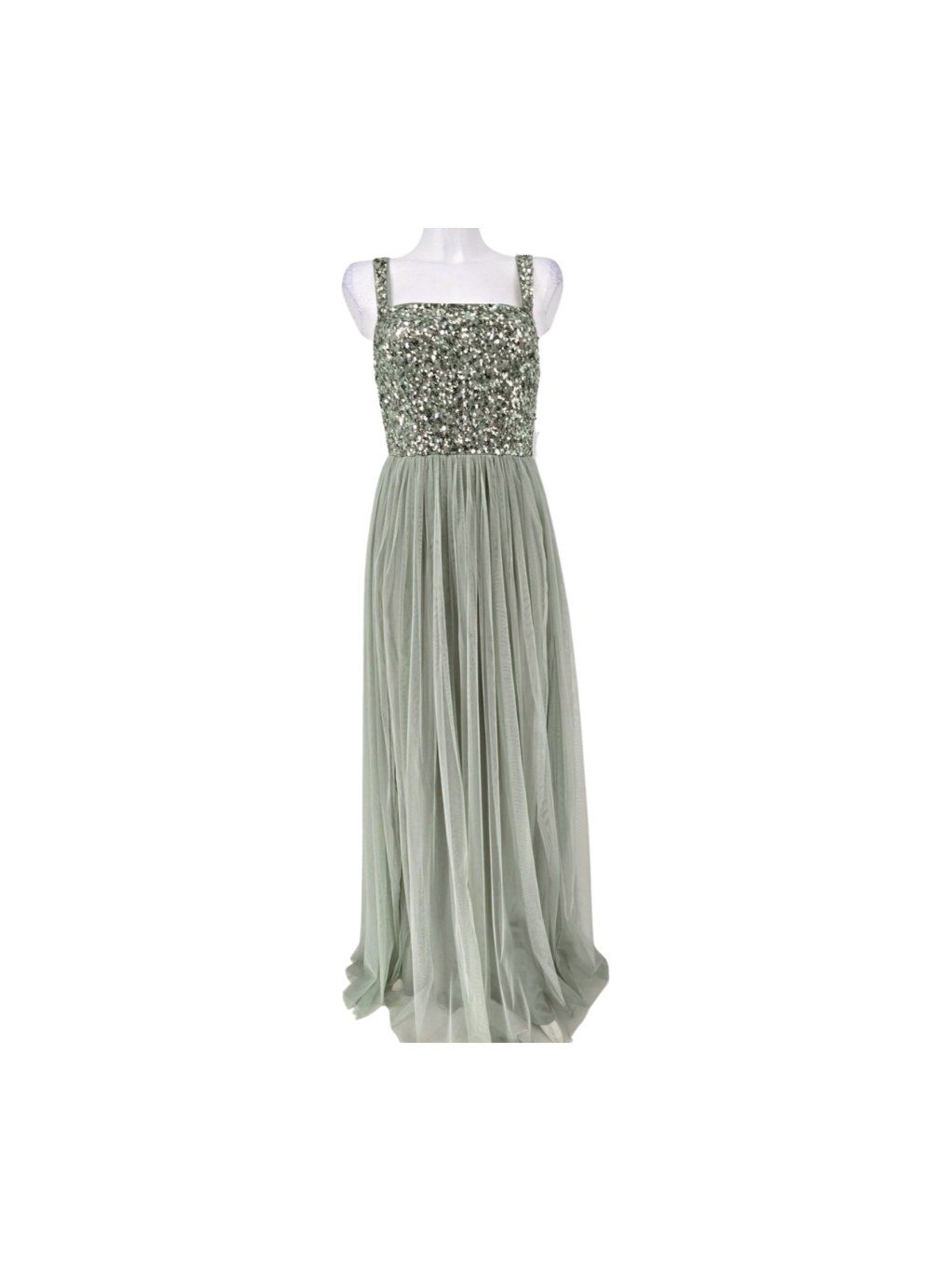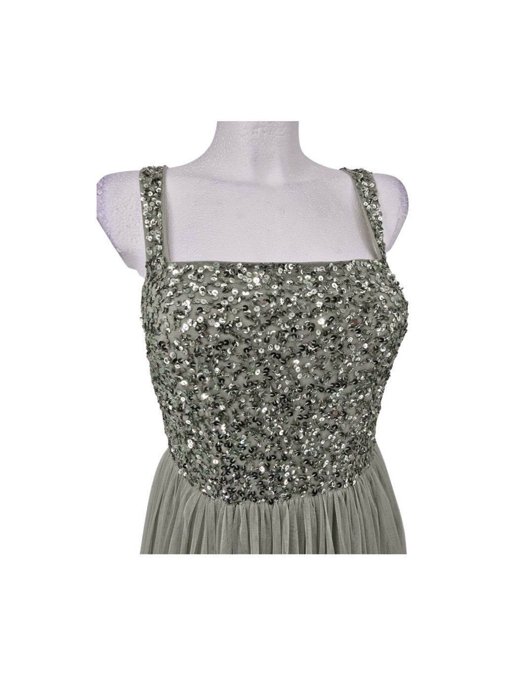 vel 6 EUR 34 , možná i 36 - dlouhé plesové šaty v jedné zelinkavo šedé barvě , s tylovou sukní , pošité flitry , pružné , zip na zádech , vespod pružná podšívka