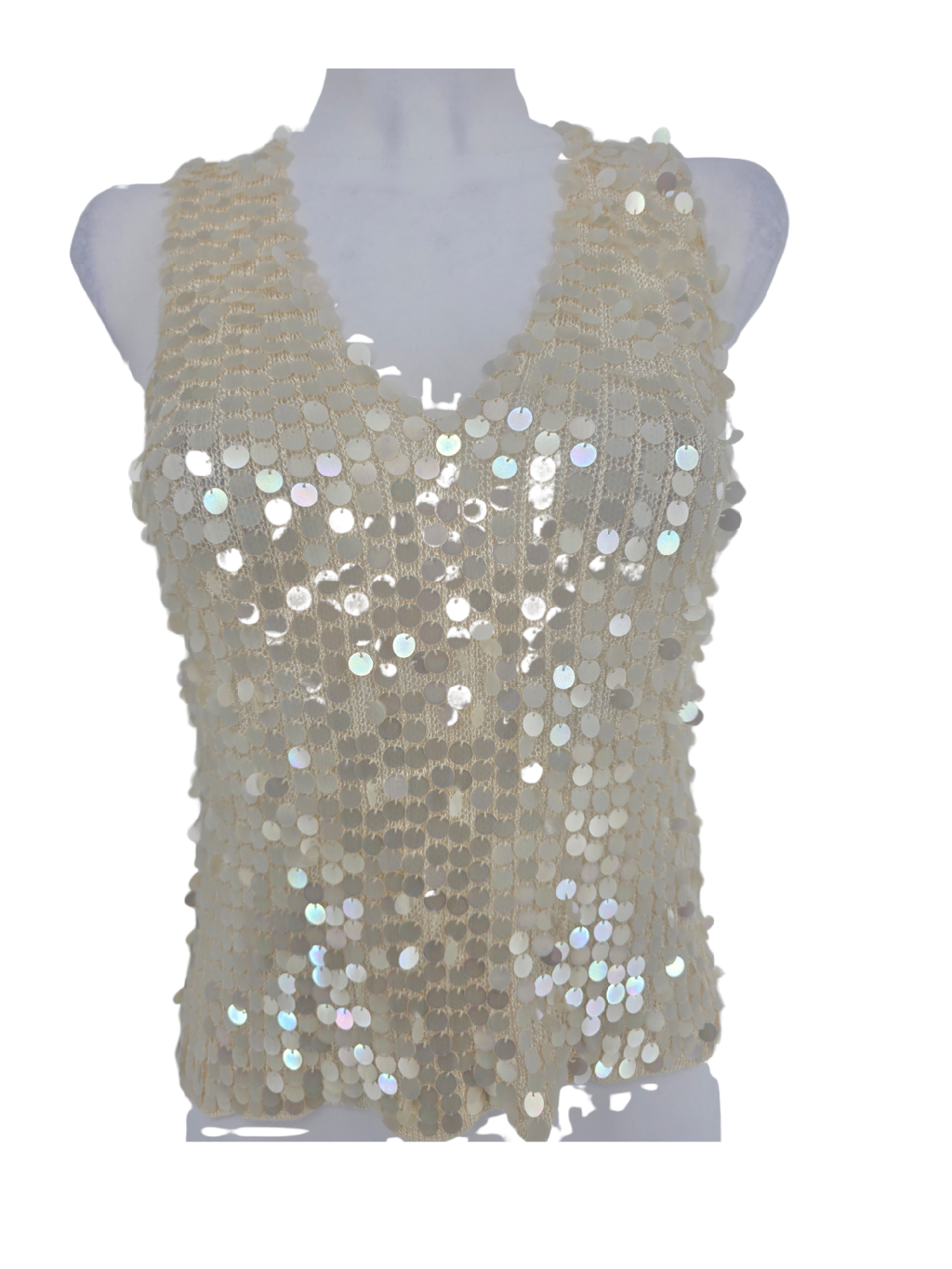 vel. UK 16 EUR 42/44 - pružný háčkovaný top pošitý perleťovými flitry