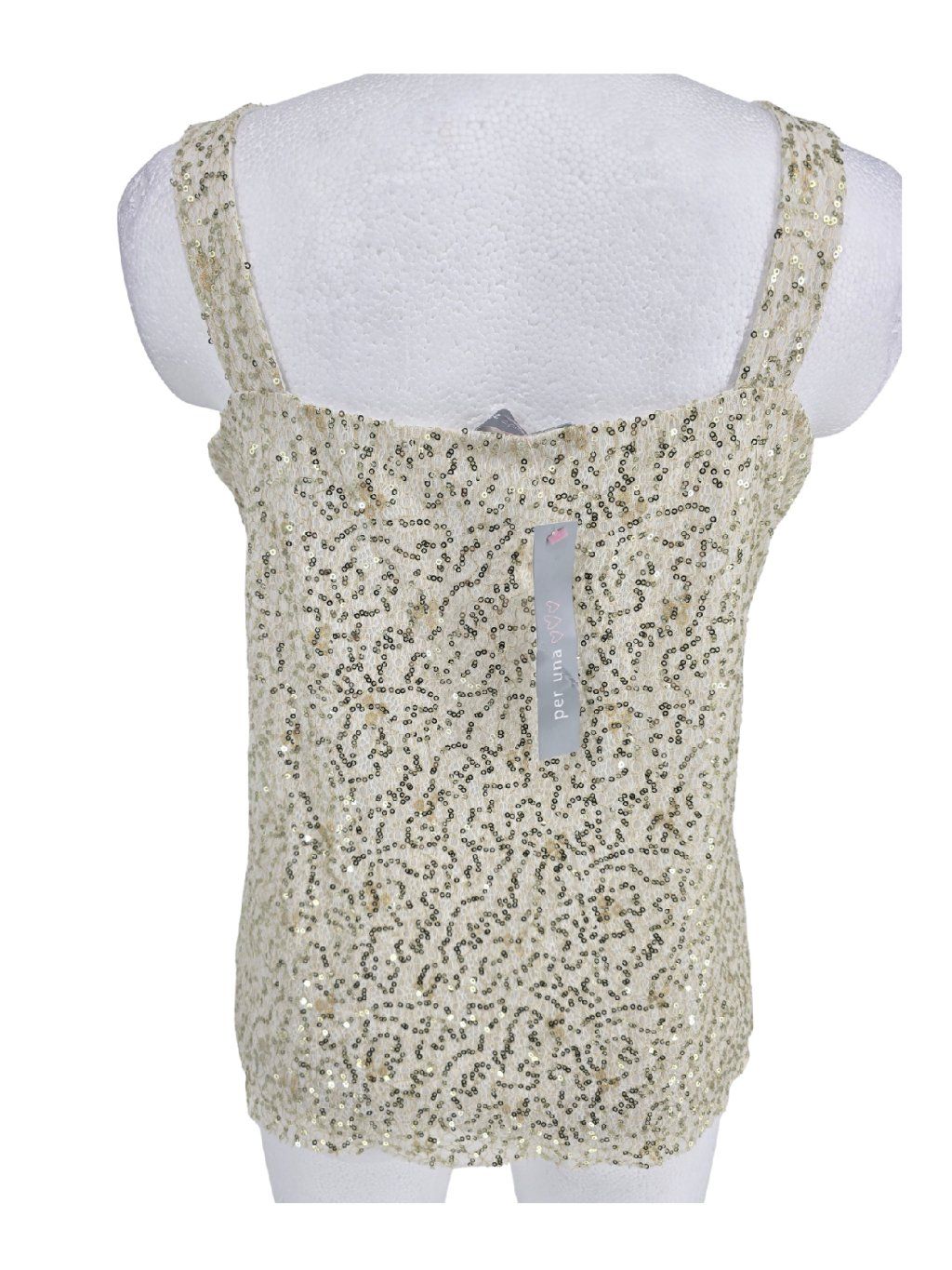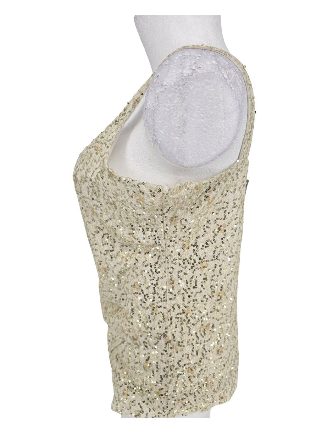 vel. UK 20 EUR 46/48 - pružný krémový top s pružnou podšívkou , horní látka je pružná krajka s našitými zlatými flitry