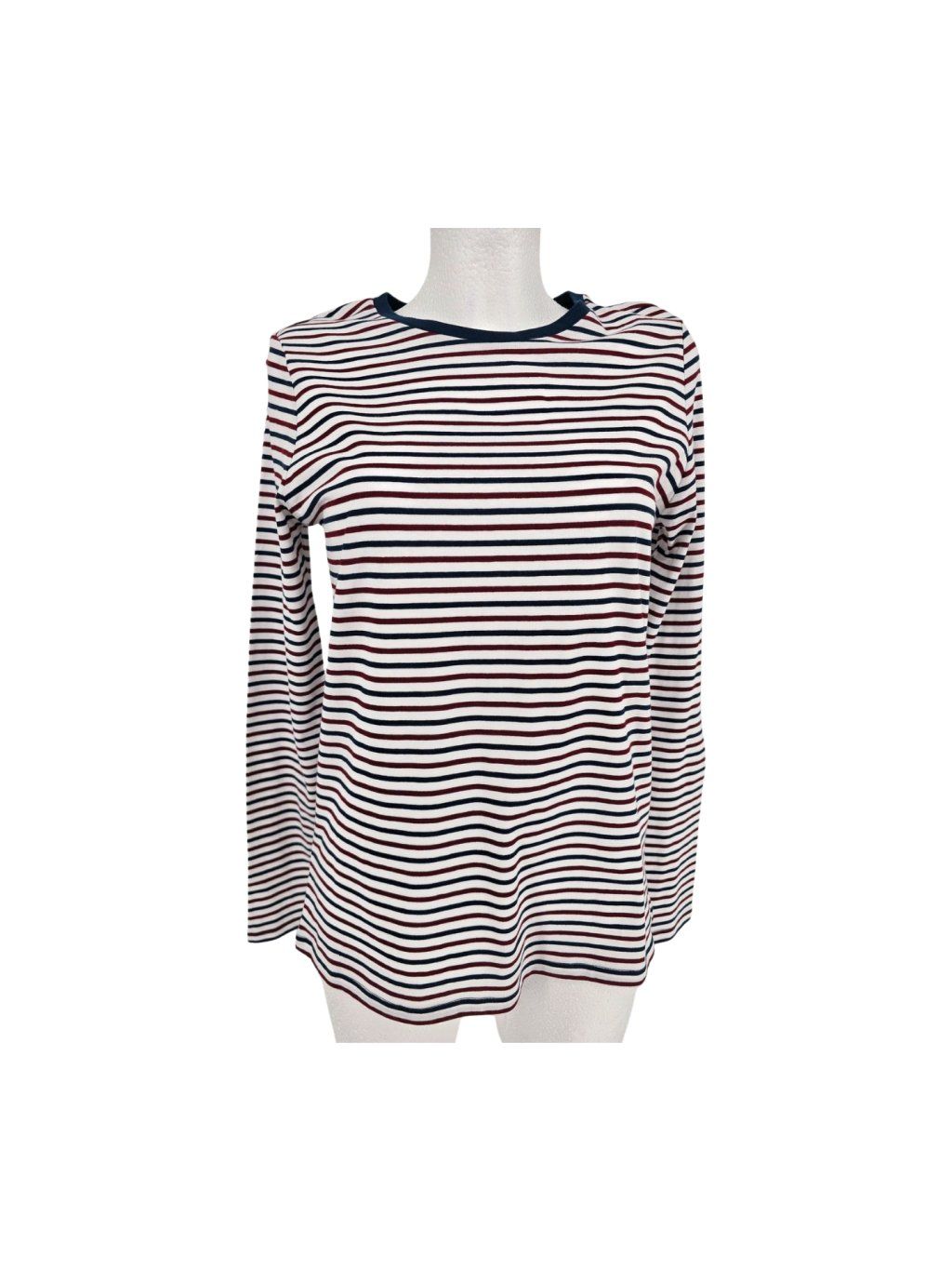 vel. UK 8 EUR 36 , ale i 38 je spíše volnějšího střihu - klasické basic bílé triko s modro vínovými pruhy